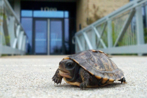 Just like the Zombie kid from 2007, we like turtles too.  On rainy days you’ll see folks checking under their cars before driving off to make sure there aren’t any turtles hanging out. Or sometimes, we find them in the most unusual places, like this wee box turtle in the picture found by NWF Staffer Ben Spector.  Spector stumbled upon him on our front doorstep and helped relocate the turtle to a safer place.  Wild, right? Well, it’s probably pretty tame, but we’re all turtle guardians and help protect the “wild” life we love.