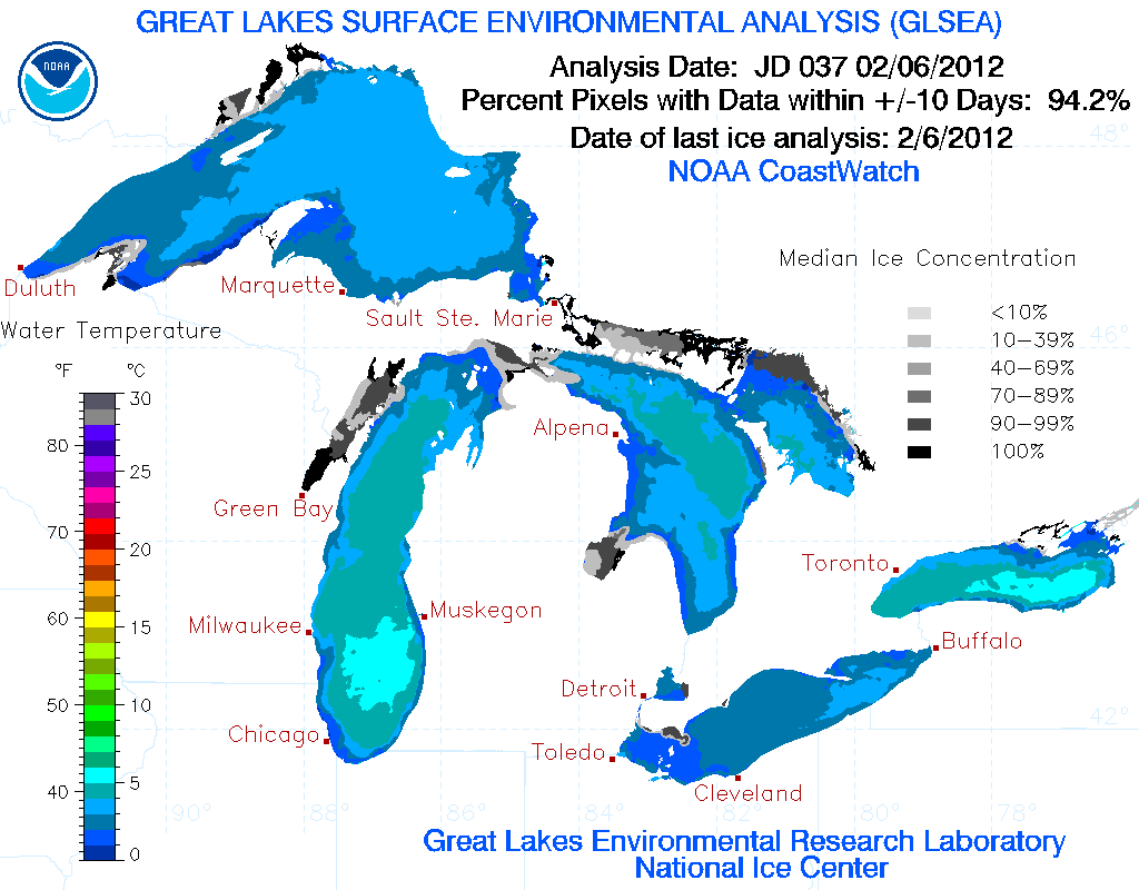 All of us in the Great Lakes region (and perhaps other regions also) are either enjoying or fretting over what is such a mild winter. Air temperatures remain above average and snowfall amounts are very small. In fact, in Michigan we’ve had more rain than snow this winter. But, what effect has this mild winter had on Great Lakes ice? Let the images speak for themselves.