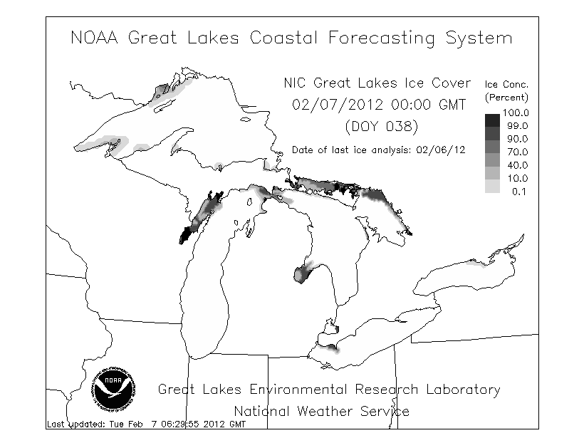 The National Oceanic and Atmospheric Administration’s (NOAA) Great Lakes Environmental Research Laboratory is creating ice forecasting models as part of their Great Lakes Coastal Forecasting System. Currently they are able to forecast circulation, temperature, and wave conditions the lakes. Ice cover and thickness will give us even more information to prepare for conditions as they come. Here is the forecast for the next ten days. Dark colors indicate ice concentration and brighter colors indicate the water temperatures.