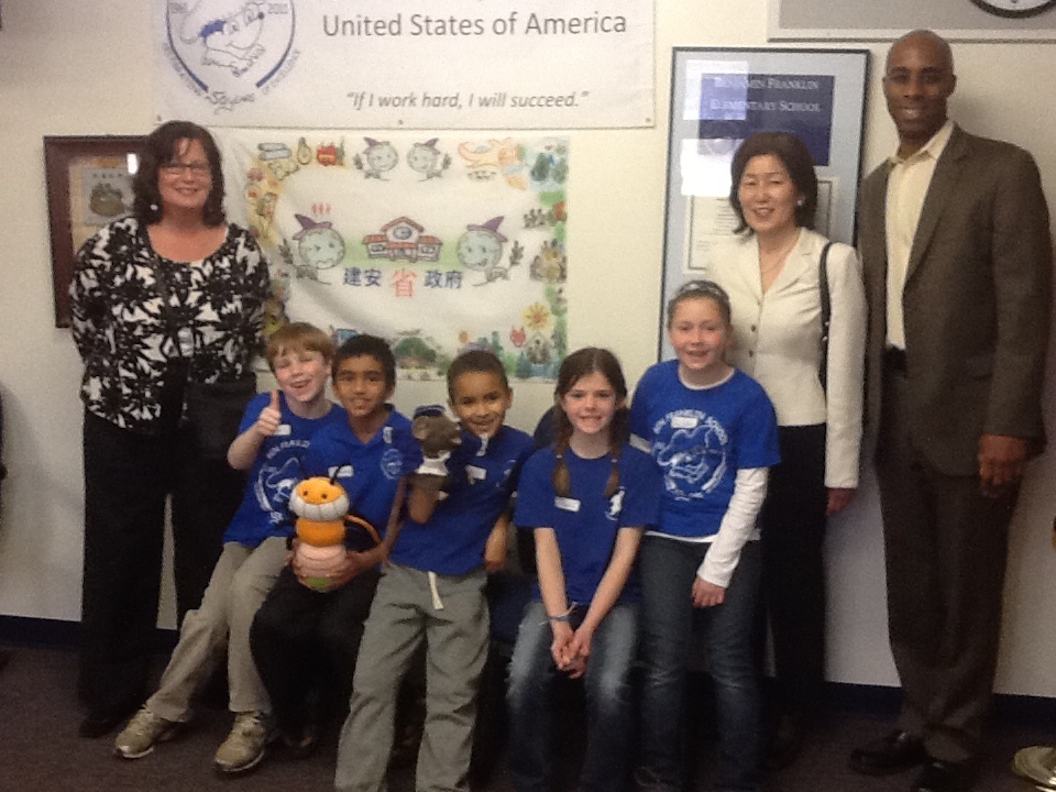 The highlight of the trip for me was the visit to Ben Franklin Elementary School. Ben Franklin is one of our registered Eco-Schools and is a Silver Award school in our program. Their motto is: “If I work hard enough, I will succeed.” Ben Franklin is a Pre-K-3 school, and the students are incredibly engaging. They also have a ‘sister school’ relationship with Jian-An Elementary in New Taipei City, Taiwan, and their principal, Mr. Christopher Turnbull, has been on a former EPA delegation to Taiwan to visit with his sister school counterparts. Even Amos the Mouse – the school’s mascot – has been to Taiwan!