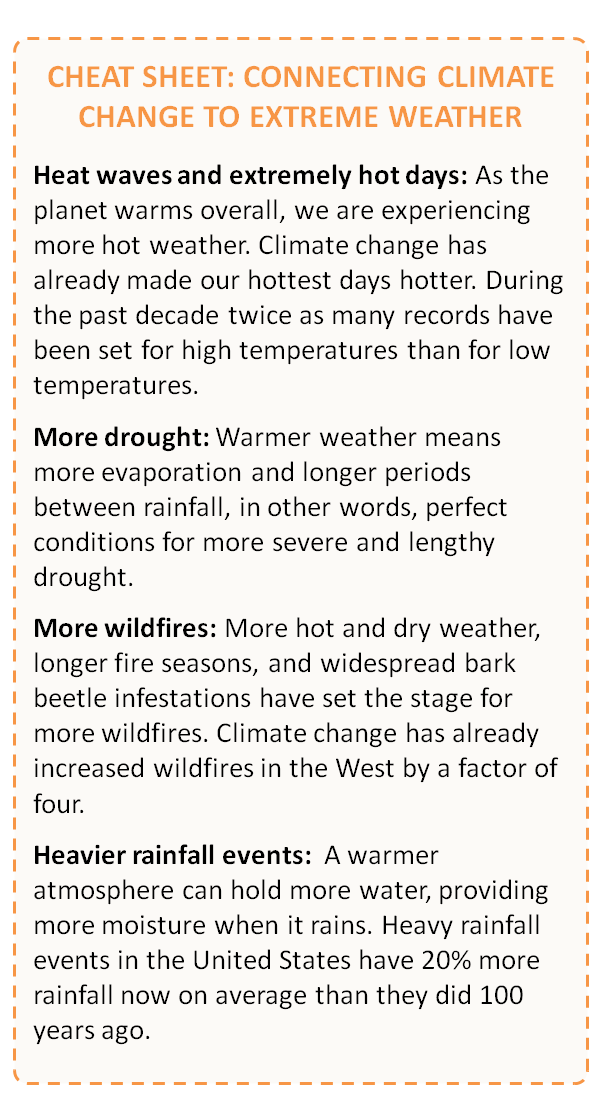 - Stick to science basics. Even if folks suspect that many weather and climate extremes of late are outside the norm, they might not understand what’s causing the changes. Yet, the logic behind why a warmer planet leads to more weather extremes is pretty straightforward. Check out our cheat sheet below for some quick explanations.