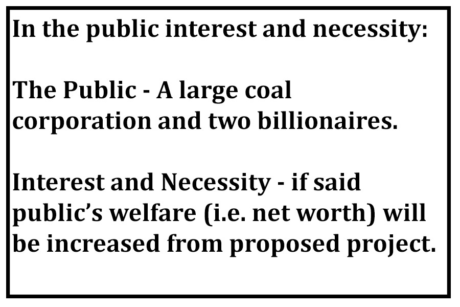 However, in order to obtain eminent domain authority, you have to convince the STB that your project is in the “public convenience and necessity.” Oh…that’s gonna be a hard sell, right? I mean, how would the public benefit from our natural resources being shipped to Asia?